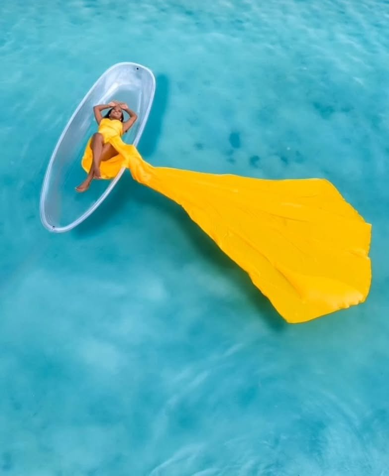 The transparent kayak lets you float above the water while still showing the vibrant ocean beneath, giving your photos a magical, almost surreal quality. The “flying dress” effect adds movement, drama, and elegance to every shot, making it perfect for fashion, personal branding, or just capturing unforgettable moments. Guides or photographers often help with positioning, angles, and dress flow to ensure each frame is picture-perfect.